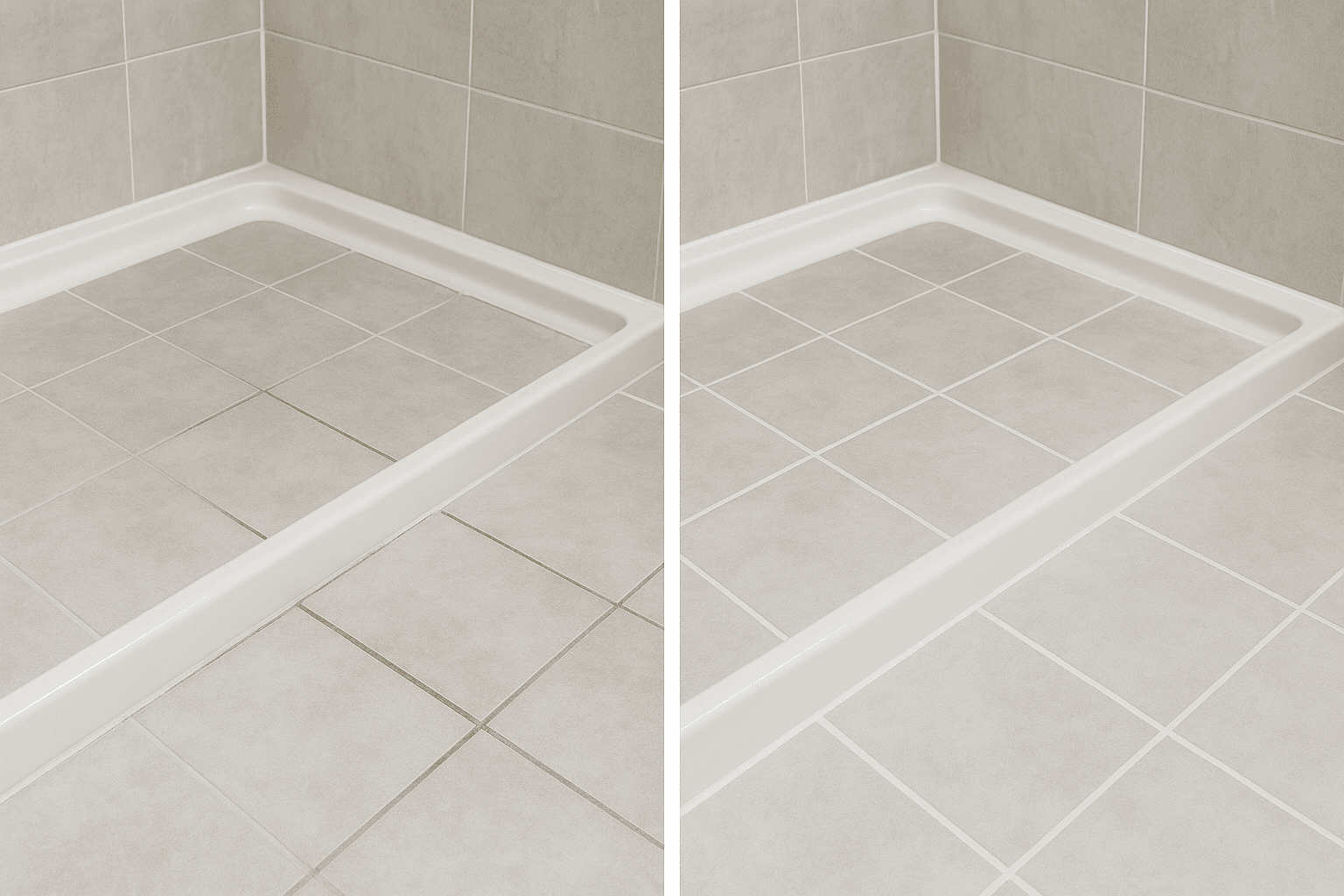 A common scenario: a 900 mm shower with sound tiles but failed grout and silicone. We remove the old grout on the floor tile field and the first wall course, install new grout, and reseal all corners. Work completes in one day; light use returns after cure per product guidance.